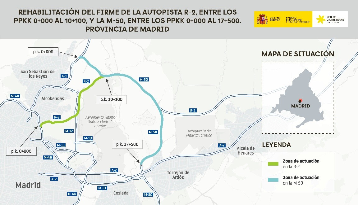 De esta forma se rehabilitarán 10,1 kilómetros de firme en la autopista R-2 interior. En concreto, se actuará desde el kilómetro 0, que se corresponde con el enlace de conexión con la M-40, hasta el kilómetro 10,1 (conexión con la M-50).