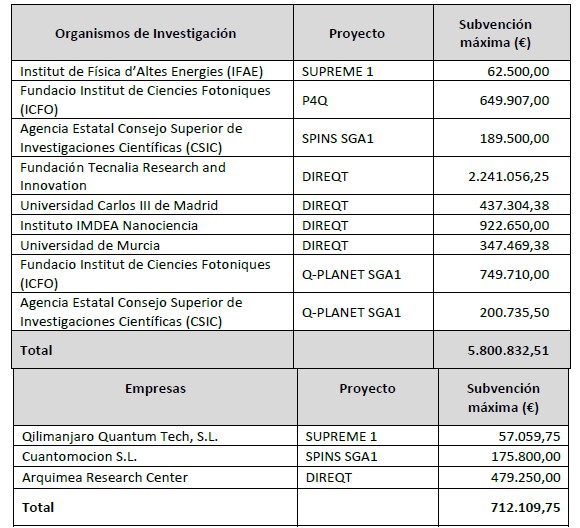 Por una parte, se han aprobado 6,5 millones de euros para financiar la participación española en cinco Líneas Piloto Cuánticas, cuyo principal objetivo es promover el desarrollo de chips cuánticos. La Chips JU aportará cerca de 8 millones de euros adicionales para los participantes españoles. Además, las empresas participantes aportarán también al proyecto, en función del tamaño de la empresa, en torno a 1,5 M€. En total suponen una inversión de 16 millones de euros destinados al desarrollo de chips cuánticos.