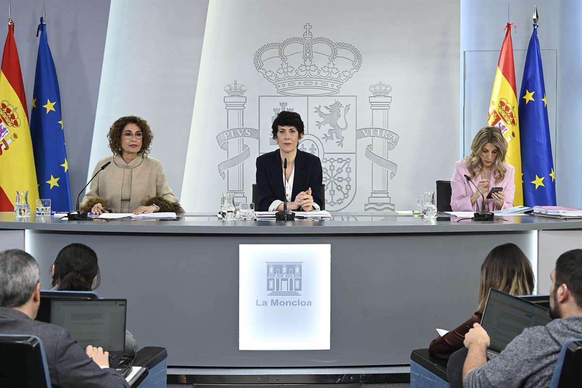 The First Vice-President and Minister for Finance, María Jesús Montero; the Government Spokesperson, Elma Saiz; and the Second Vice-President and Minister for Labour and Social Economy, Yolanda Díaz, at the press conference after the Council of Ministers | Pool Moncloa/José Manuel Álvarez