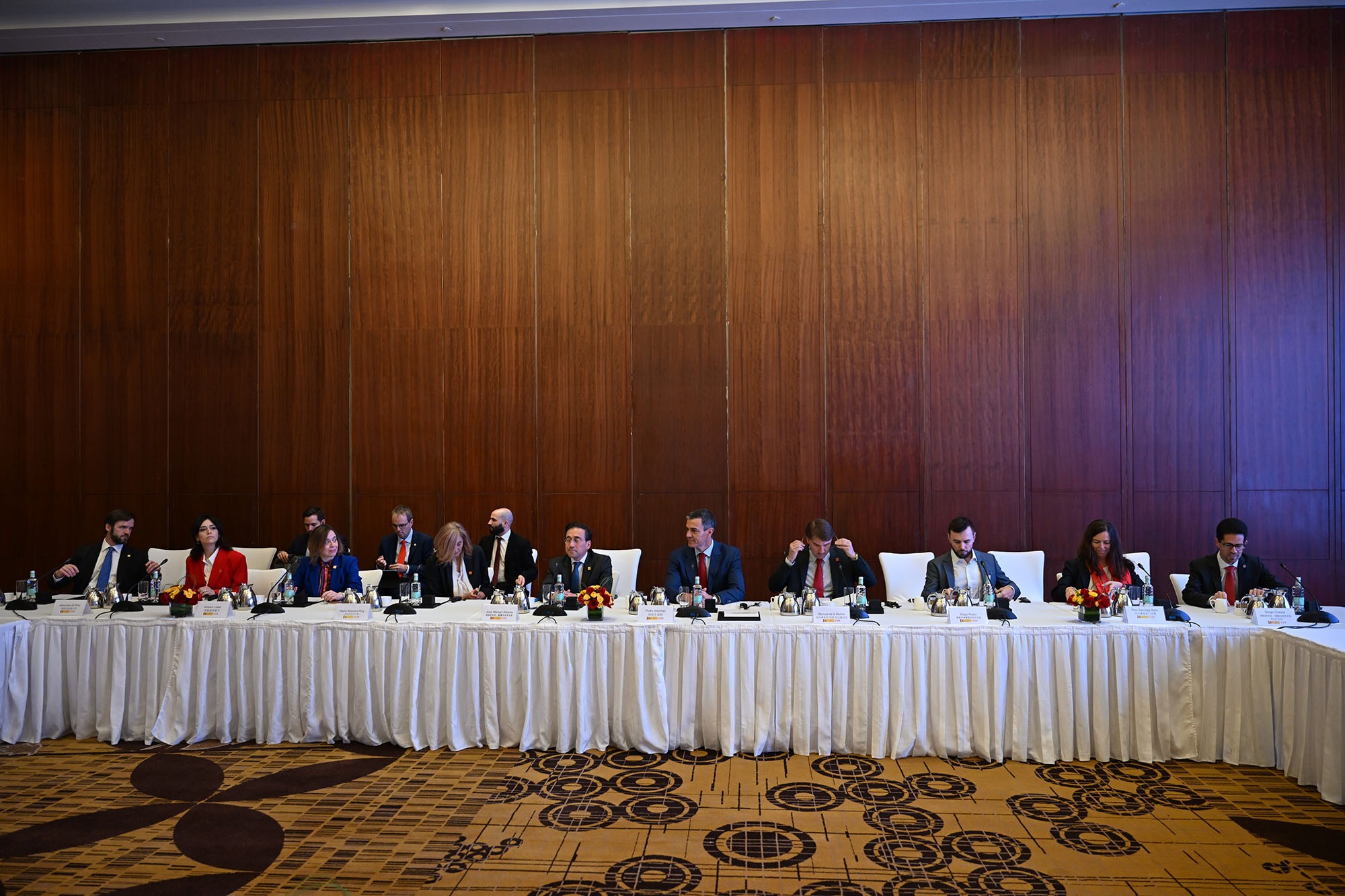 The President of the Government of Spain, Pedro Sánchez, and the Minister for Foreign Affairs, European Union and Cooperation, José Manuel Albares, during the meeting with Chinese businessmen | Pool Moncloa/Borja Puig. 2026.4.14