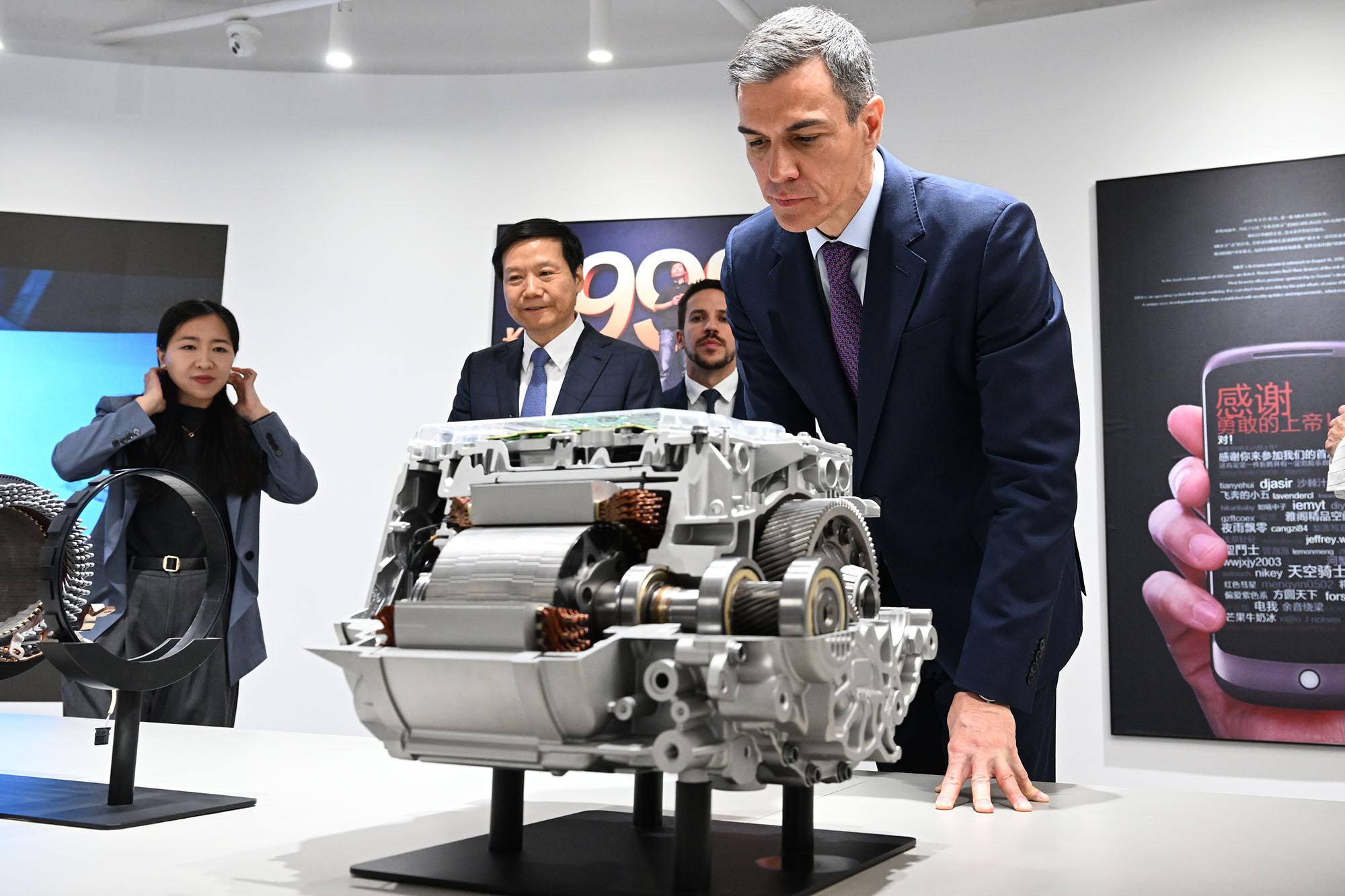 The President of the Government of Spain, Pedro Sánchez, observes an engine at the Xiaomi...
