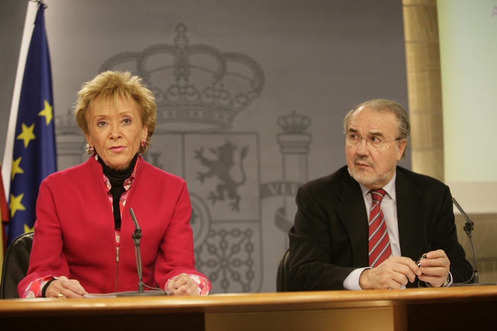 María Teresa Fernández de la Vega, vicepresidenta primera, ministra de la Presidencia y portavoz del Gobierno, junto con Pedro Solbes Mira, vicepresidente segundo y ministro de Economía y Hacienda, comparecen ante los medios de comunicación después del Consejo de Ministros.