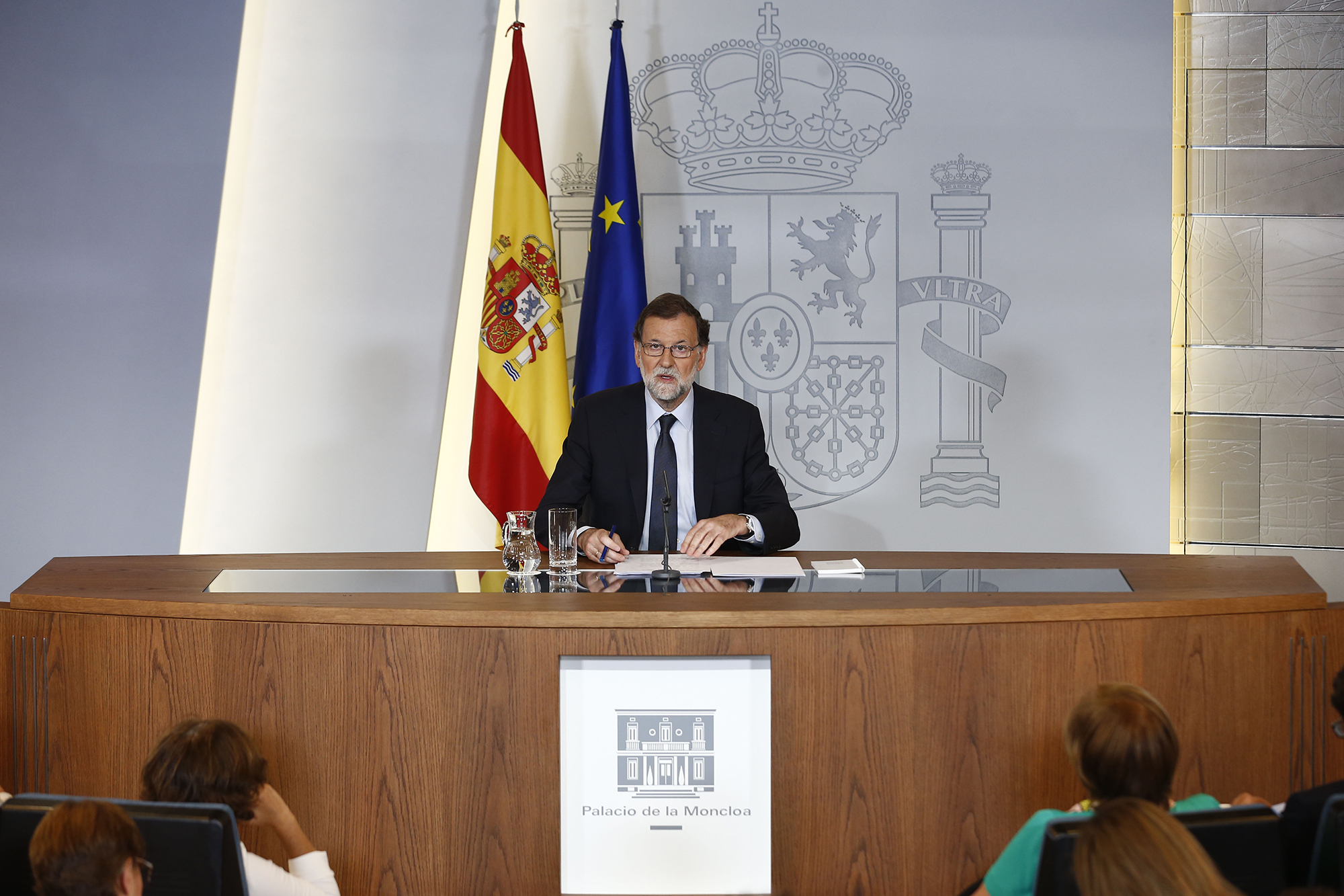 El presidente del Gobierno, Mariano Rajoy, durante la rueda de prensa posterior al Consejo de Ministros, en la que ha valorado la situación tras los atentados en Cataluña. | Pool Moncloa/Diego Crespo. La Moncloa, Madrid - 25.8.2017