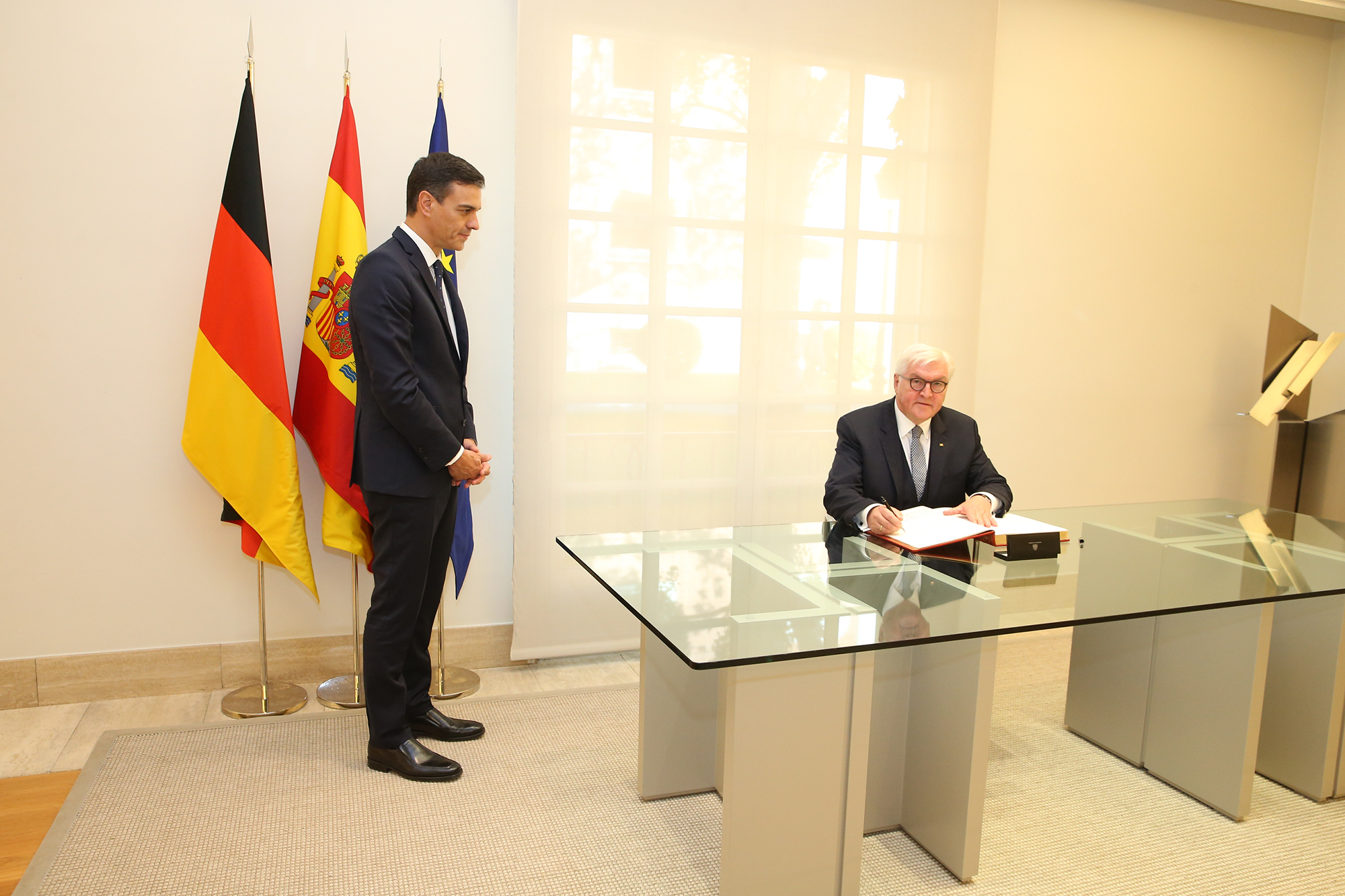 El presidente de la República Federal de Alemania, Frank-Walter Steinmeier, firma en el Libro de Honor de La Moncloa en presencia del presidente del Gobierno, Pedro Sánchez. | Pool Moncloa / Fernando Calvo. La Moncloa, Madrid - 24.10.2018