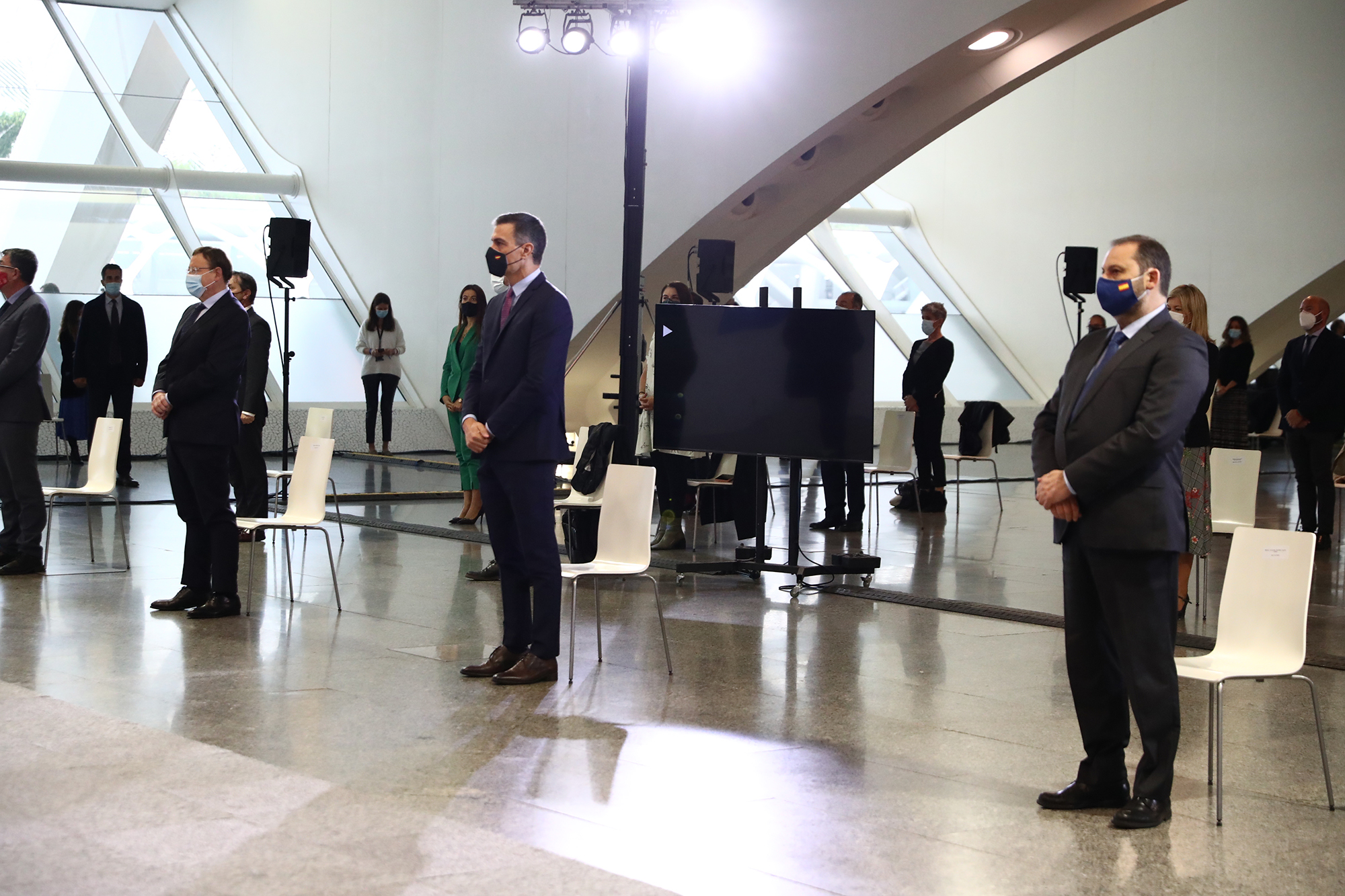 El presidente del Gobierno, Pedro Sánchez; el ministro de Transportes, Movilidad y Agenda Urbana, José Luis Ábalos, y el presidente de la Generalitat valenciana, Ximo Puig, al inicio del acto de presentación. | Pool Moncloa/Fernando Calvo. Museo de las Ciencias, Valencia - 5.11.2020