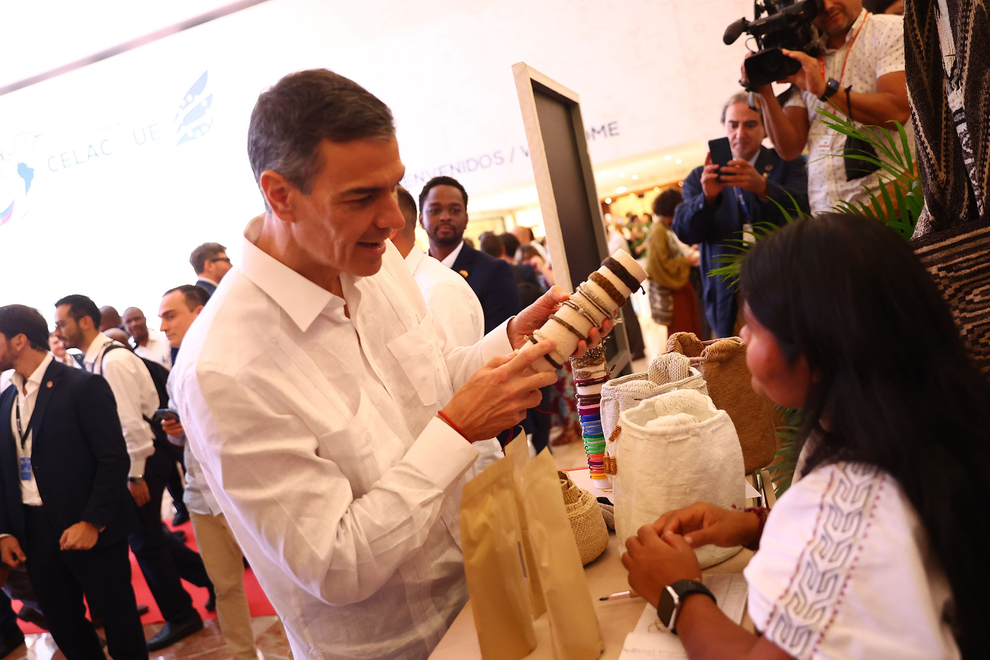 El presidente del Gobierno, Pedro Sánchez, con pulseras de artesarnía colombiana