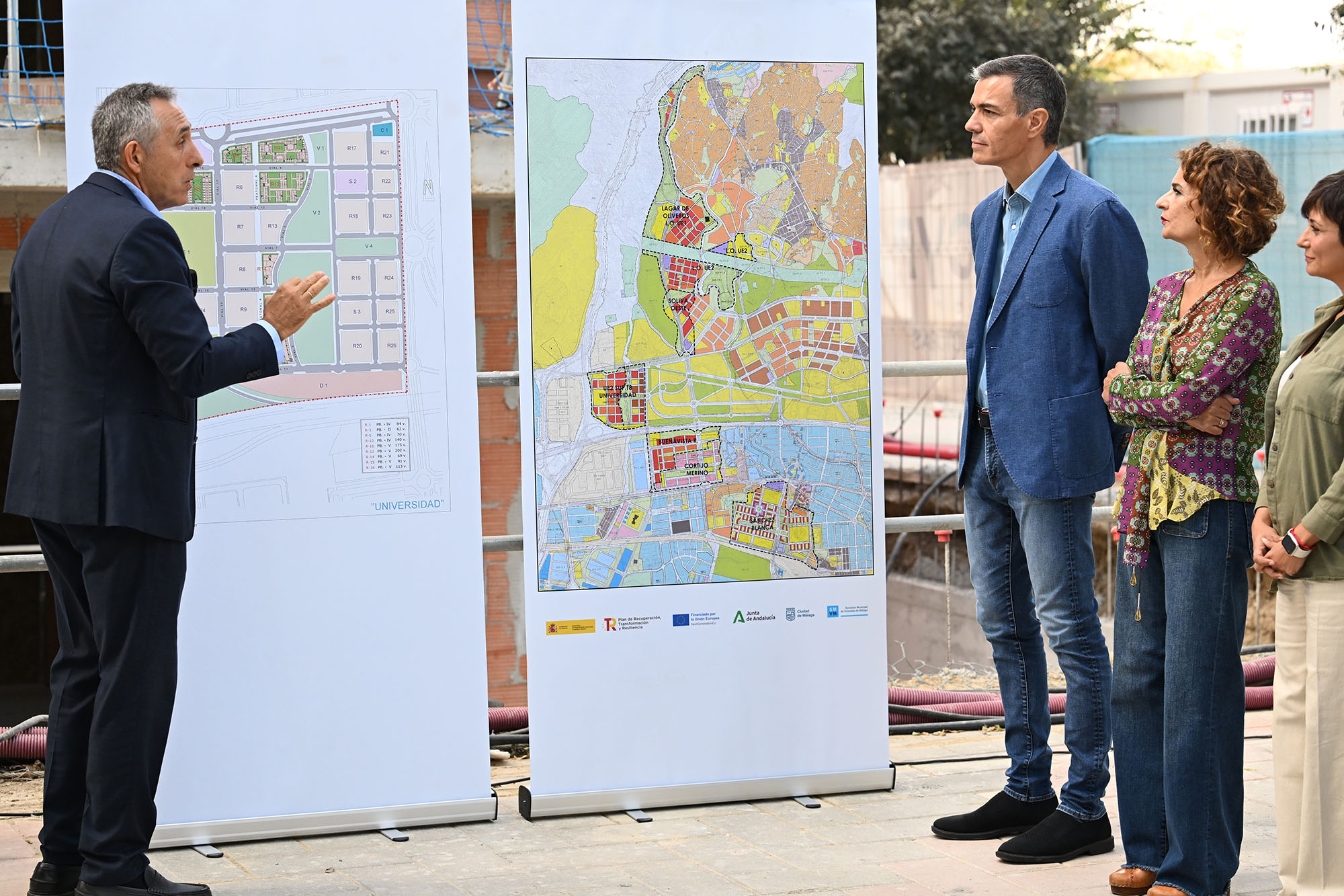El presidente del Gobierno, Pedro Sánchez, y la vicepresidenta primera y ministra de Hacienda, María Jesús Montero, junto a los planos de la promoción de viviendas. | Pool Moncloa/Borja Puig de la Bellacasa. Málaga - 14.9.2025