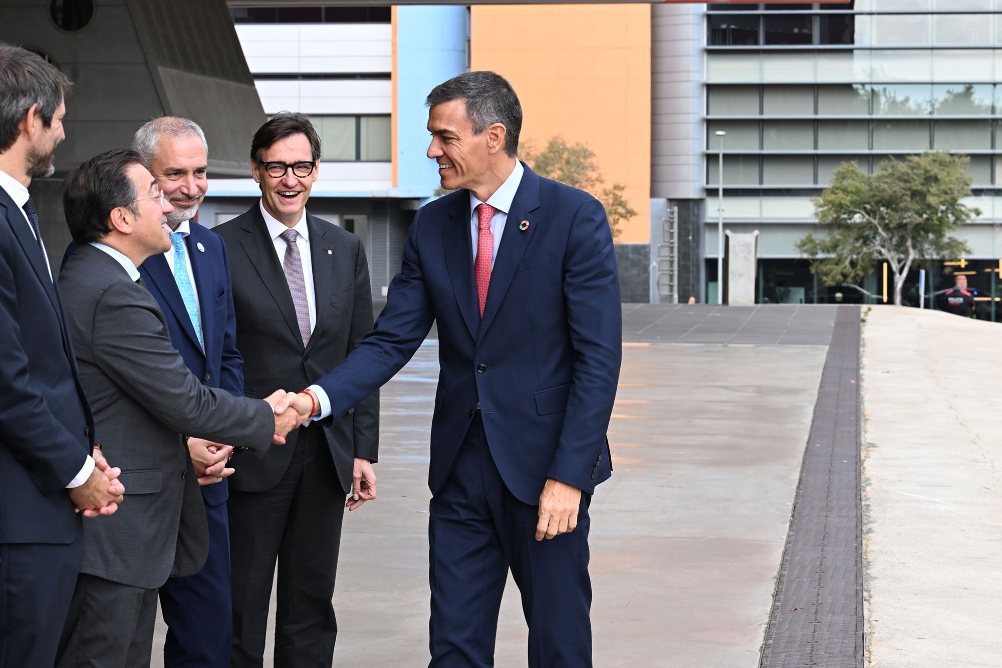 El presidente del Gobierno, Pedro Sánchez, saluda al ministro de Asuntos Exteriores, Unión Europea y Cooperación, José Manuel Albares, a su llegada. | Pool Moncloa/Borja Puig de la Bellacasa. Barcelona - 29.9.2025