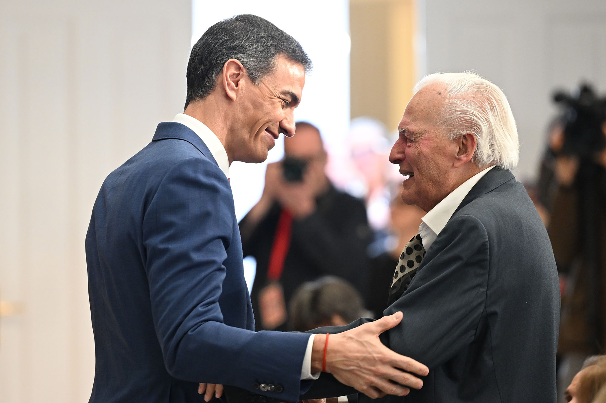 El presidente del Gobierno, Pedro Sánchez, saludando a Juan de Dios Ramírez Heredia, uno de los condecorados durante el acto. | Pool Moncloa/Borja Puig. La Moncloa - 21.2.2026