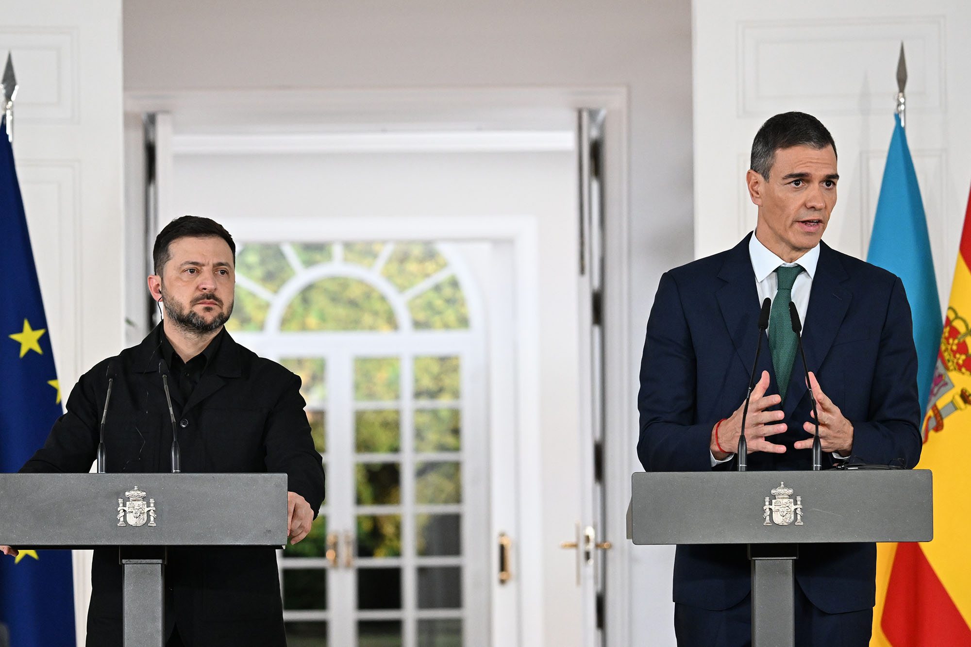 El presidente de Ucrania, Volodímir Zelenski, y el presidente del Gobierno, Pedro...