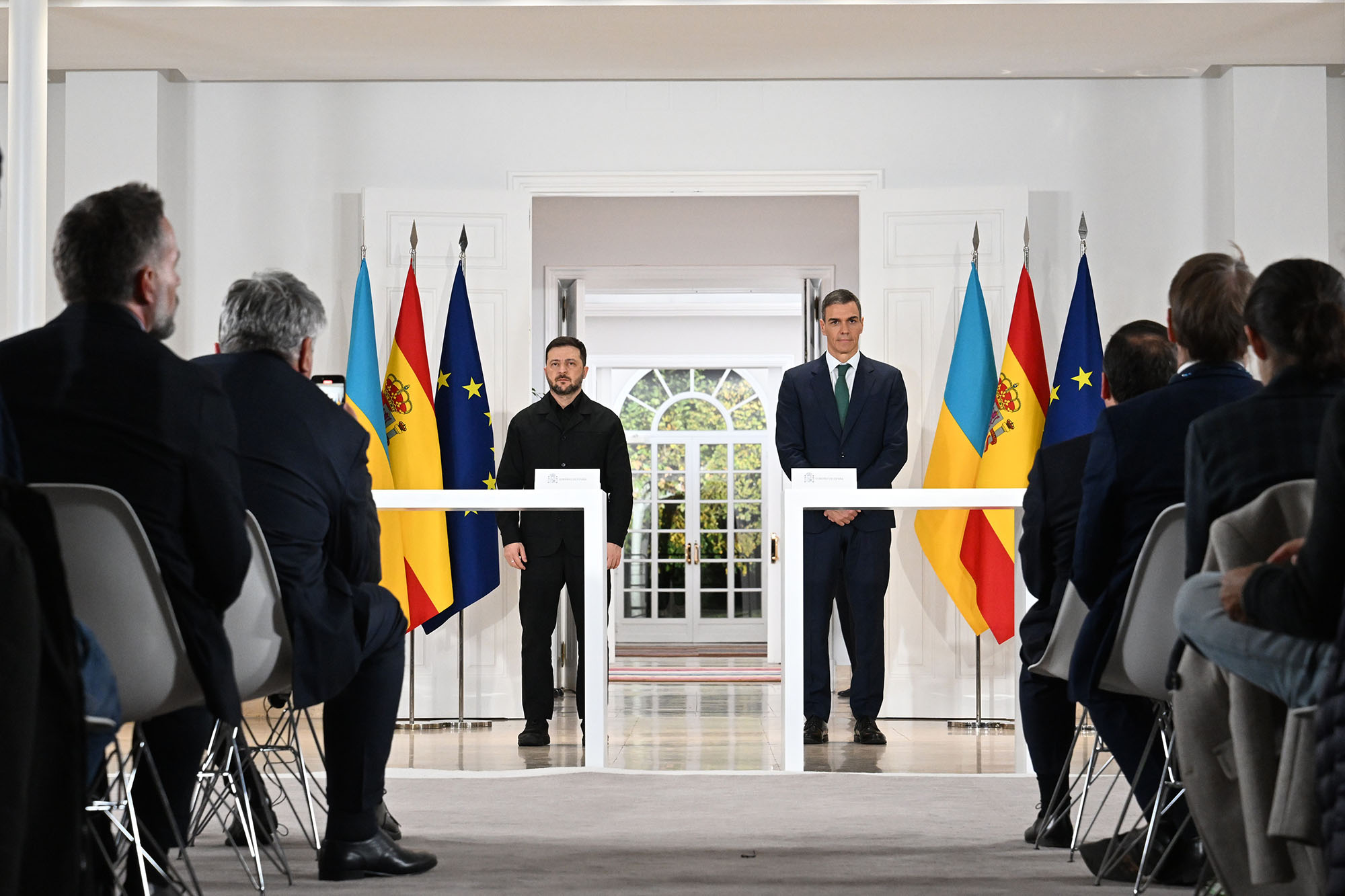 Los presidentes Pedro Sánchez y Vorodímir Zelenski, durante el acto de la firma de acuerdos | 18.11.2025