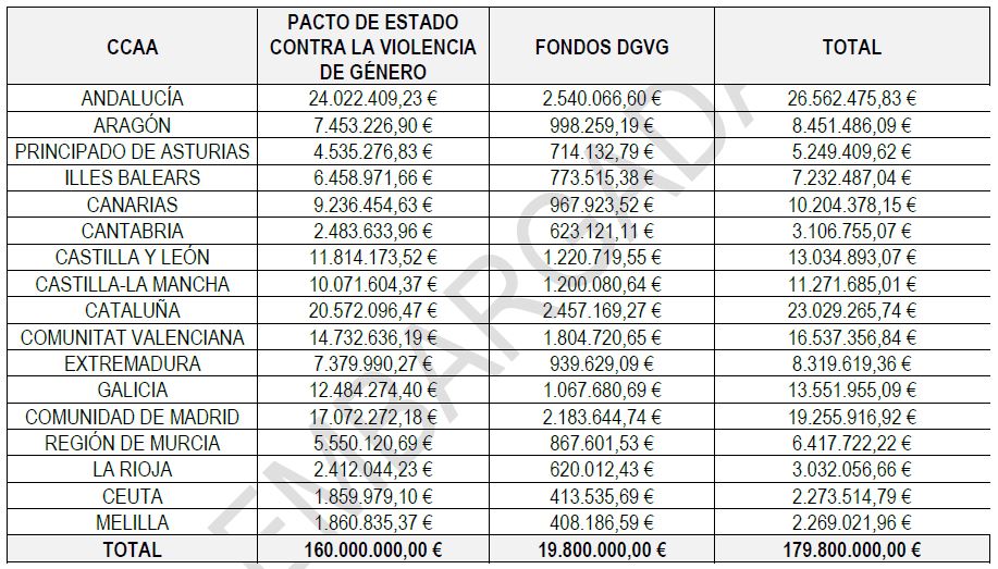 El Ministerio de Igualdad, las comunidades autónomas y las ciudades autónomas de Ceuta y Melilla han acordado, en la Conferencia Sectorial de Igualdad, la distribución de 179,8 millones de euros destinados a la lucha contra la violencia de género y en el marco del Pacto de Estado contra este tipo de violencia machista.