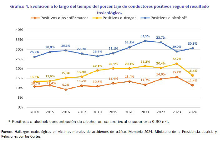 Tal y como se desprende de la Memoria 2024 de Hallazgos Toxicológicos en Víctimas de Accidente de Tráfico, elaborada por el Instituto Nacional de Toxicología y Ciencias Forenses con la colaboración del Observatorio Nacional de Seguridad Vial, casi la mitad (48,2%) de los conductores fallecidos en carretera en 2024 que fueron sometidos autopsia y a un análisis toxicológico dieron positivo en alcohol, drogas o psicofármacos, aisladamente o en combinación, frente al 53,6 % del año 2023.