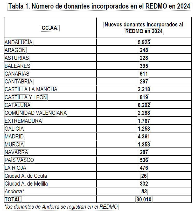 En la pasada edición celebramos el gran logro de haber superado los 500.000 donantes voluntarios inscritos en el REDMO, objetivo principal del Plan Nacional de Médula Ósea (PNMO), impulsado por la ONT en el año 2012. En 2024 se sumaron 30.010 nuevos donantes, y en los ocho primeros meses de 2025 ya se han inscrito 16.051 más, lo que eleva el total a 515.450 personas registradas (cada año se dan de baja los donantes que superan los 60 años). La Tabla 1 muestra los donantes incorporados al REDMO en 2024 por Comunidades Autónomas.
