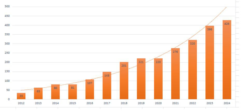 El dinamismo del REDMO ha impulsado un aumento récord de solicitudes; en 2024 se realizaron 715 peticiones de donación de médula, un 11% más que en 2023. Finalmente, 426 donantes españoles completaron la donación de médula ósea (donación efectiva) el pasado año para pacientes en España y en más de 30 países. Este número supone un crecimiento del 8% respecto al año anterior. Cuando se inició el PNMO en 2012, solo se llevaron a cabo 35 donaciones efectivas: la cifra se ha multiplicado por 12 desde entonces (Figura 1). Es importante destacar que en la actualidad la mayoría de estas donaciones (88%) se realizan con sangre periférica, sin necesidad de puncionar la médula ósea. Hoy, la probabilidad de encontrar un donante en el REDMO es del 90%, frente al 82% en 2012, y el tiempo medio de búsqueda se ha reducido a 27 días.